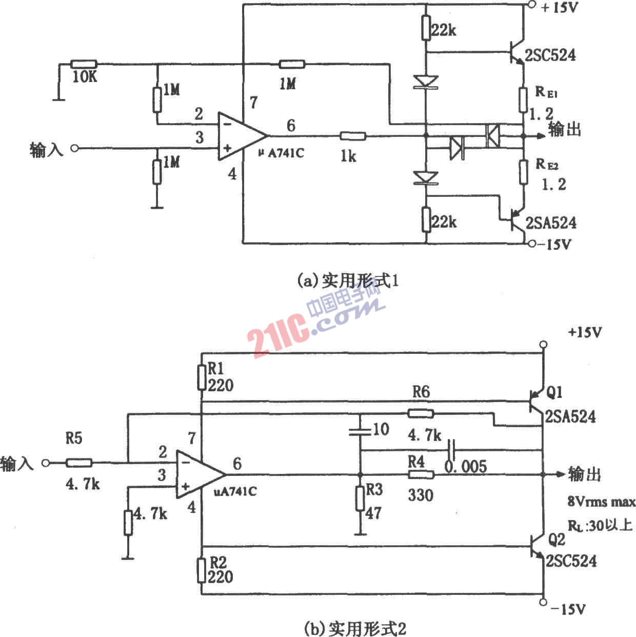 第一種實(shí)用形式如圖(a)所示,該電路的結(jié)構(gòu)是在運(yùn)放的輸出端加上互補(bǔ)對稱射極跟隨器,這種形式結(jié)構(gòu)簡單,使用方便,但電源利用率較低。由圖(a)知,電路中兩個(gè)三極管的射極分別串接了電阻RE(1.2Ω),其作用是對功放三極管實(shí)施過流保護(hù),在集成運(yùn)放的輸出端(引腳6)外接1kΩ的電阻,對μA741也起過流保護(hù)作用。圖(a)中,其電壓放大倍數(shù)約為101,4個(gè)二極管均為1S953,功放管為對管,型號為2SC524和2SA524。