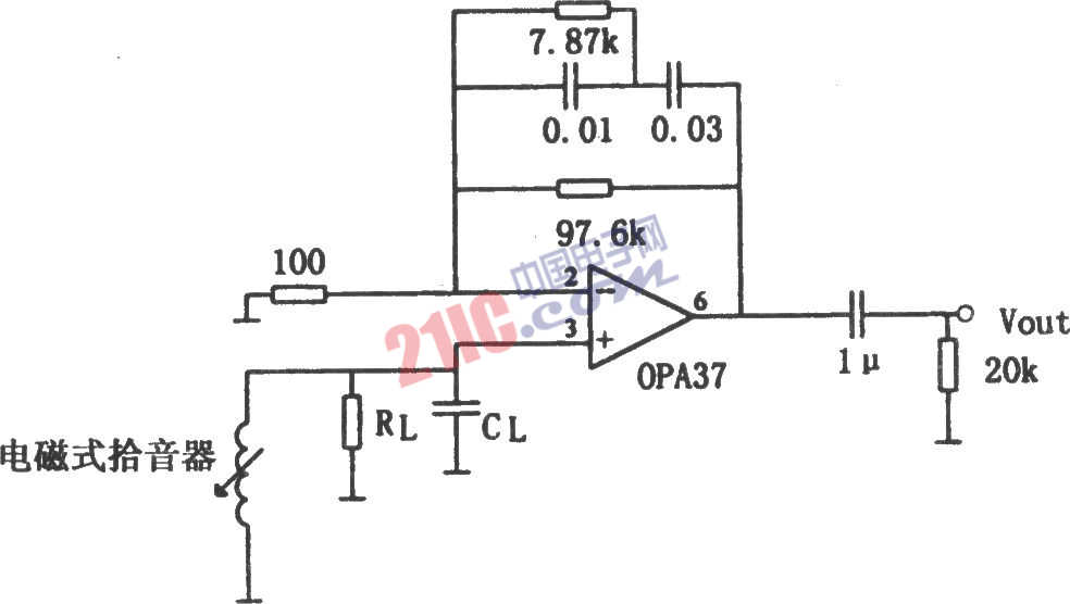 如圖所示為OPA37構成的低噪聲前置放大器。輸入信號加在OPA37的同相輸入端(引腳3),電路中的RL、CL為電磁式拾音器的負載阻抗,其阻值和容量可依拾音器的特性而定(一般依據(jù)拾音器生產廠家推薦的參數(shù)選用之)。圖中所有電阻均應選用金屬膜電阻(精度為1%),其電容均應選用有機膜電容器。在輸入信號為1kHz時,其增益約為100倍。