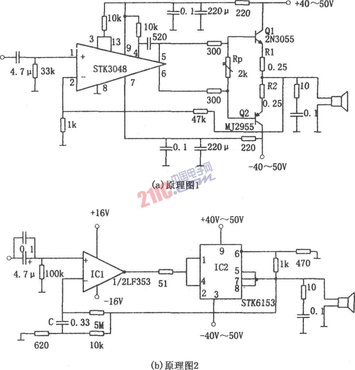 圖(b)所示電路的前置放大采用LF353集成運(yùn)放,該運(yùn)放為場(chǎng)效應(yīng)管輸入型雙運(yùn)放,后級(jí)采用厚膜功放集成塊STK6153。該功放塊采用全互補(bǔ)對(duì)稱結(jié)構(gòu),轉(zhuǎn)換速率快、精度高、噪聲低、功率大,由于其內(nèi)部使用恒流源偏置,故工作穩(wěn)定可靠,其外殼散熱器與內(nèi)部電路絕緣,使用非常方便,圖示電源電壓為±(40~50)V,必要時(shí)可采用電容去耦電路,以降低電源的紋波干擾,電路增益可通過(guò)適當(dāng)改變負(fù)反饋支路的電阻加以調(diào)整。