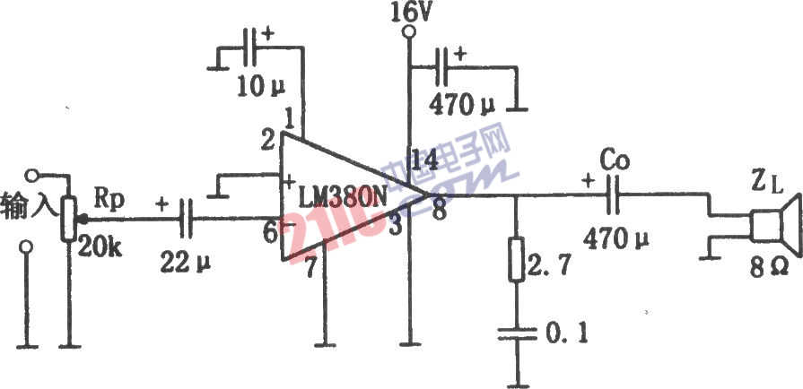 如圖所示為2W音頻功率放大電路。該電路采用了14腳封裝的LM380作為放大器件,輸入信號(hào)經(jīng)音量控制電位器Rp(20kΩ)和22μF的耦合電容加到運(yùn)放LM380的反相輸入端(引腳6),其同相輸入端(引腳2)接地,引腳1外接10μF的濾波電容,以濾除高頻紋波干擾,電路采用16V單電源供電,并在電源端(引腳14)到地之間外接470μF的去耦電容,其輸出端(引腳8)到地之間有兩個(gè)并聯(lián)支路:一支路由2.7Ω電阻與0.1μF電容串聯(lián)組成,用于提高電路的穩(wěn)定性,濾除部分高頻,防止產(chǎn)生高頻自激振蕩;另一支路由470μF的耦合電容Co和負(fù)載ZL(8Ω喇叭)組成,Co和ZL決定了電路的下限截止頻率fL。由圖中的參數(shù)可得出其下限截止頻率為: fL=1/(2πZLCo)=1/(2π×8×470×10-6)=42Hz。顯然,欲降低下限截止頻率,可適當(dāng)增大Co的值。LM380的電壓放大倍數(shù)為固定值50,該值由其內(nèi)部反饋電路所決定,不需外接元件,其最大輸出功率可達(dá)2.5W,但輸出功率較大時(shí),其電源電壓的紋波干擾將增大,故一般選用輸出功率為2W。該器件的電源電壓適用范圍較寬:l0~22V,輸入阻抗也較高:約為150kΩ。