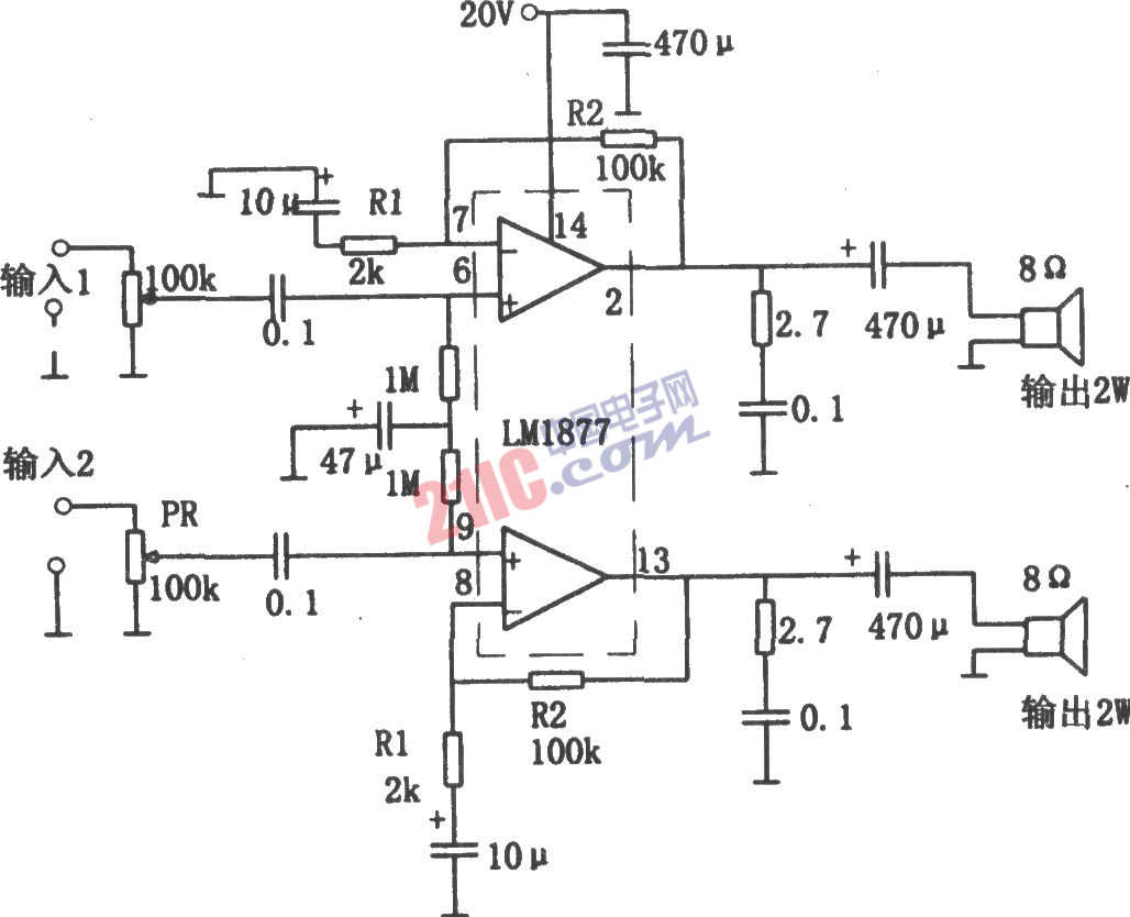 如圖所示為2W×2音頻功率放:該電路采用了雙集成運(yùn)放LM1877作為放大器件。由圖可知,電路為上、下對(duì)稱結(jié)構(gòu),有兩路信號(hào)分別加到LM1877的兩個(gè)運(yùn)放的同相輸入端,其輸出端外接方式相同:由2.7Ω電阻和0.1μF的電容組成高頻濾波電路,以防止高頻自激;耦合電容Co(470μF)和負(fù)載電阻ZL(喇叭:8Ω)將輸出功率轉(zhuǎn)換為聲音輸出,且Co和ZL的大小還決定了電路的下限截止頻率fL,三者之間的關(guān)系為:fL=1/(2πZLCo),對(duì)于圖示參數(shù),其fL=42Hz。電路中,輸入端的100kΩ電位器為音量控制元件,0.1μF的電容為耦合元件(隔直流,通交流)。由于LM1877內(nèi)部的兩個(gè)運(yùn)放均采用同相輸入方式,因而其輸入阻抗很高,電路的電壓放大倍數(shù)由反饋支路電阻R2和Rl所確定,即Av≈R2/R1=100kΩ/2kΩ=50。該電路的電源電壓為20V,每一路的輸出功率均為2W,電源電流約為500mA,因此兩路輸出時(shí),其電源電流可達(dá)1A。LM1877的電源電壓的工作范圍很寬,約為6~24V,需要小功率輸出時(shí),可適當(dāng)降低電源電壓,其開(kāi)環(huán)輸入差模電阻約為4MΩ。