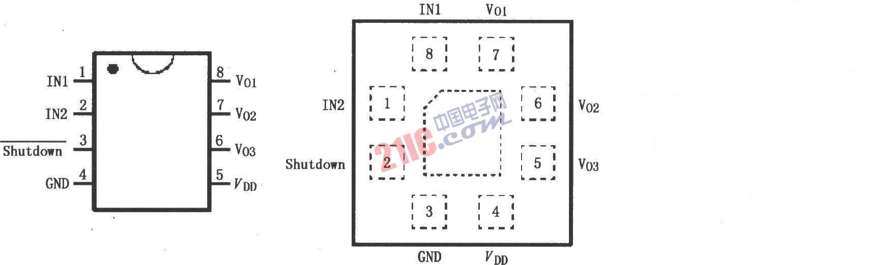 LM4910是音頻功率放大器,主要設計用于便攜式設備,采用3.3V電源供電,能夠輸出35mW連續(xù)平均功率,帶動32Ω負載。LM4910利用新的拓撲電路,取消了耳機放大器輸出耦合電容和半電源旁路電容,它包含先進的“喀-撲”聲消除電路,這種噪聲在轉換開關通斷瞬間產生。LM4910的引腳排列如圖所示。