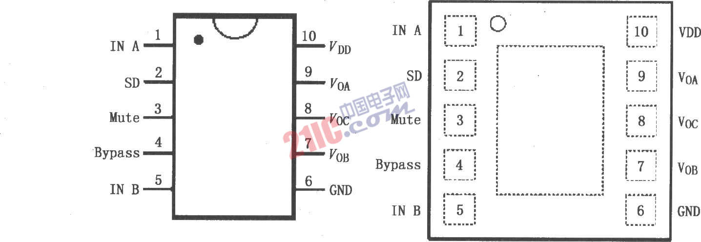 LM4911是立體聲耳機(jī)放大器,采用3.3V電源供電,每個(gè)通道能夠輸出40mW連續(xù)平均功率帶動(dòng)16Ω負(fù)載,或每個(gè)通道輸出25mW連續(xù)平均功率帶動(dòng)32Ω負(fù)載。LM4911可采用單端電容耦合輸出或OCL輸出的結(jié)構(gòu),有低功耗關(guān)斷模式和功率靜噪模式,當(dāng)快速導(dǎo)通時(shí)輸出端釋放變化電壓低于1mV。LM4911還含有內(nèi)部熱關(guān)斷保護(hù)機(jī)構(gòu),其引腳排列如圖所示。