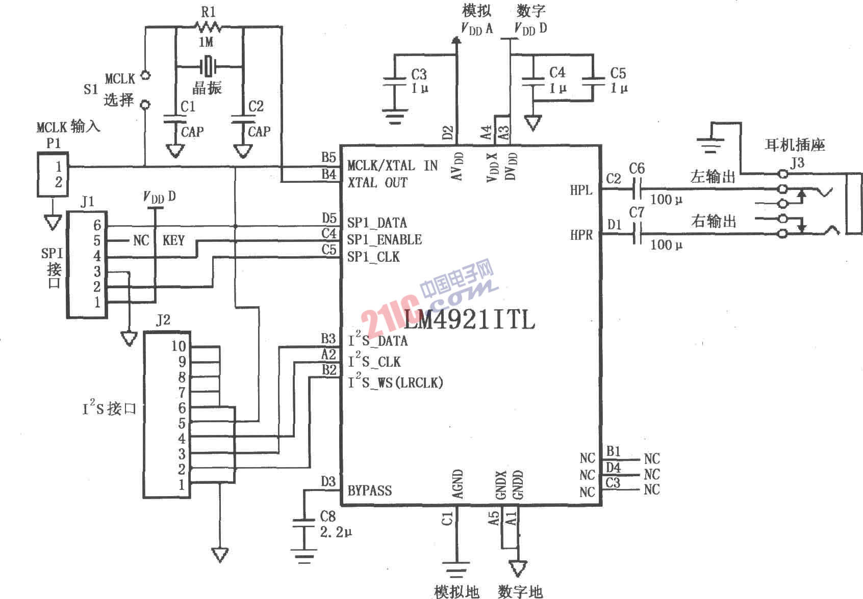 如圖所示為LM4921用于雙聲道耳機放大器的典型電路。由SPI接口總線J1輸入控制線信號:串行數(shù)據(jù)信號SPI- DATA,串行使能信號SPI-ENABLE,串行時鐘信號SPI-CLK。由I2S接口總線J2輸入全范圍的串行數(shù)字音頻信號:I2S數(shù)據(jù)信號I2S-DATA,I2S時鐘信號I2S-CLK。I2S字選信號I2S-WS(又稱Right/Left Select)。由P1輸入MCLK信號:當S1斷開時選擇外部主時鐘MCLK輸入;當 S1短接時選擇內(nèi)部晶振(11.2896MHz)。立體聲耳機輸出由J3輸出,采用100μF電容作為隔直流電容,以防止輸出直流電流損壞耳機。LM4921的模擬電源與數(shù)字電源分別獨立。