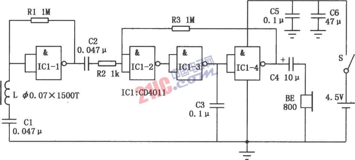 感應(yīng)式無(wú)線耳機(jī)廣泛用于電化教學(xué)、家庭電視和音響的音頻信號(hào)無(wú)線接收,使用時(shí)既可消除耳機(jī)接線帶來(lái)的不便,又可避免對(duì)他人休息、學(xué)習(xí)的干擾。本電路主要由四與非門集成電路CD4011及少量外圍元件組裝而成,電路簡(jiǎn)單、音質(zhì)優(yōu)良、不用調(diào)試、一裝即成。