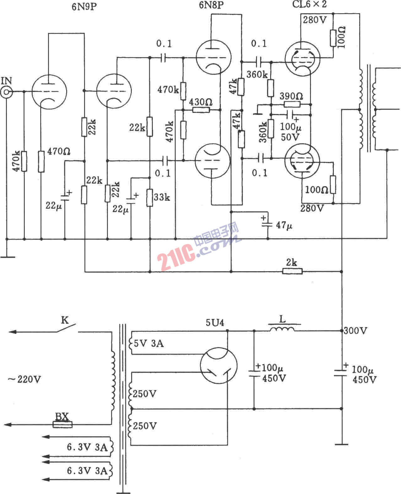 當(dāng)推挽功放級的負(fù)載阻抗取5kΩ時(shí),6L6功放管在A類推挽狀態(tài)下,屏極電壓取280V,零信號至滿信號時(shí)屏極電流變化為120~140mA,輸出功率為l5W。如用6L6功放管作AB類推挽工作時(shí),屏極電壓可取得高一些。當(dāng)屏壓為360V時(shí),從零信號到滿信號時(shí)的屏極電流I變化為85~135mA,輸出功率可達(dá)到30W。