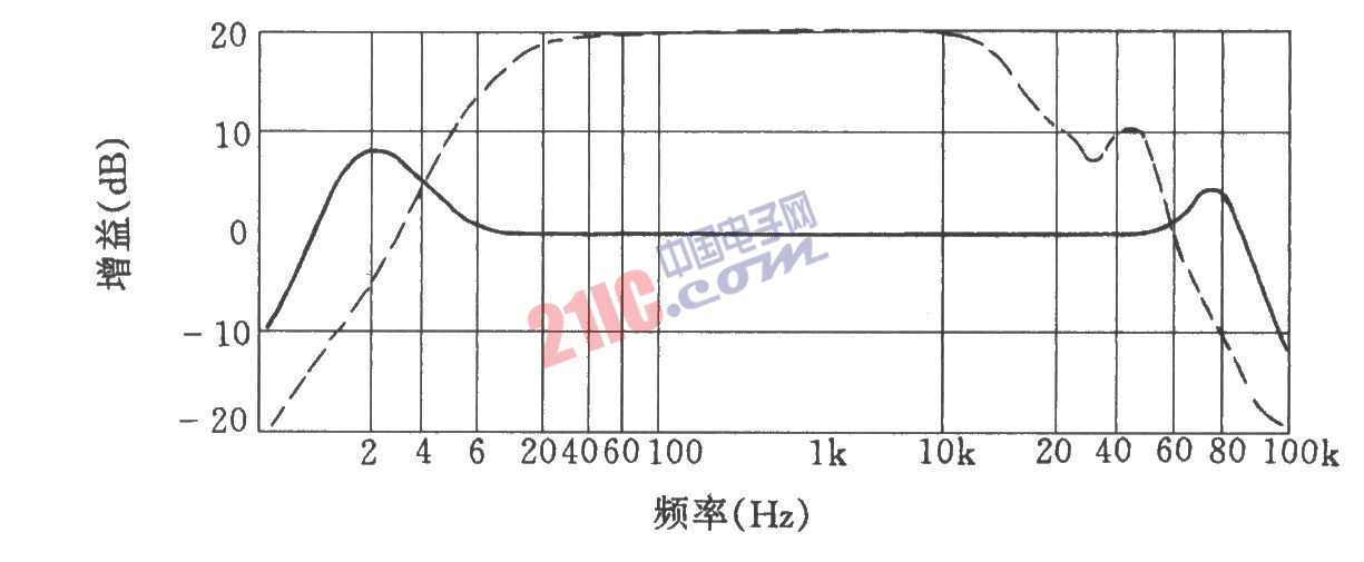 上圖曲線中,虛線為未加頻率補償前的頻響曲線圖;實線為加頻率補償后的頻響曲線圖。