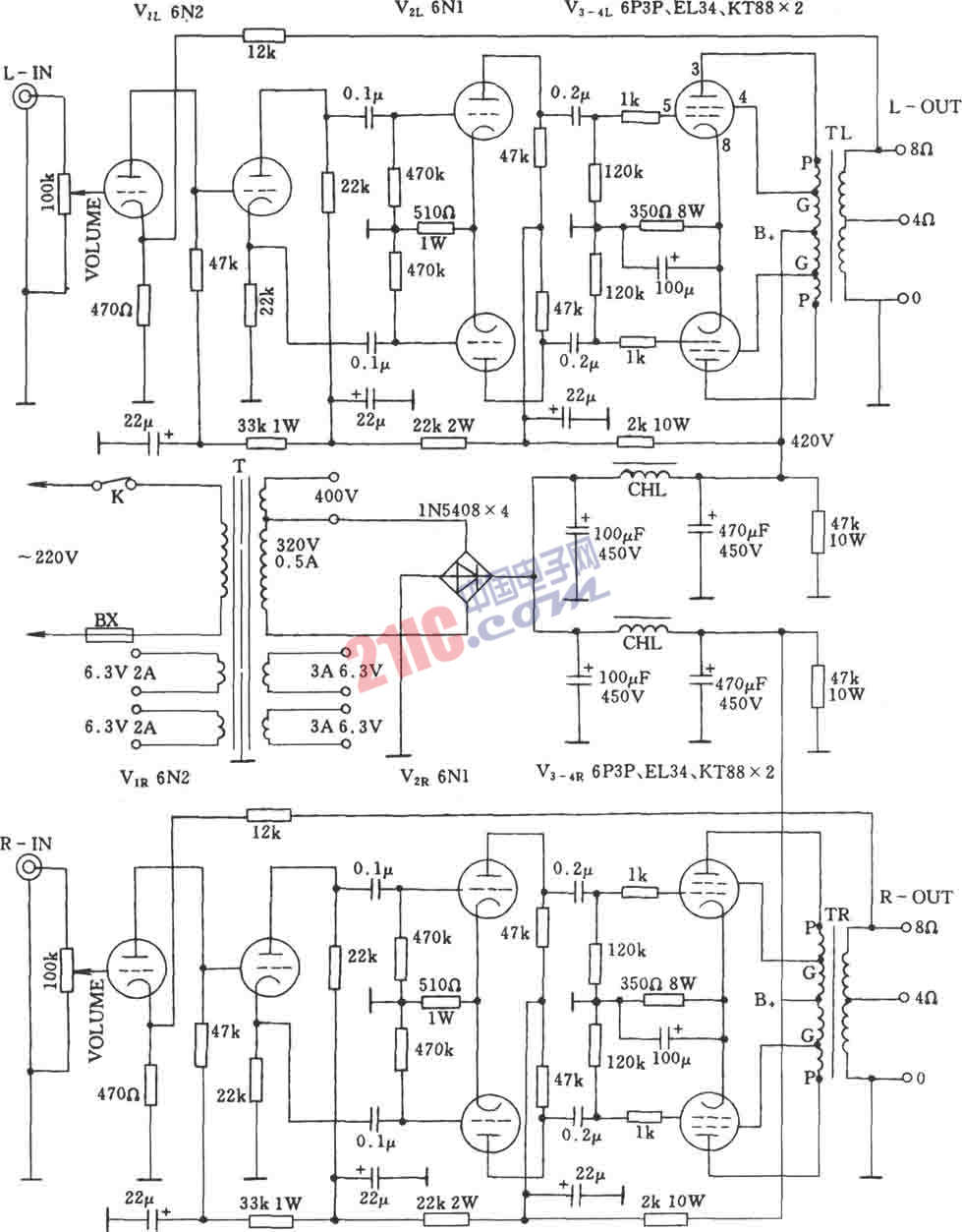 當(dāng)推挽功放管采用KT88、6550、KTl00時(shí),其輸出功率可達(dá)60W+60W;如推挽功放管采用EL34、6CA7時(shí),其輸出功率為40W+40W;女H推挽功放管采用6P3P、6L6時(shí),其輸出功率為30W+30W。