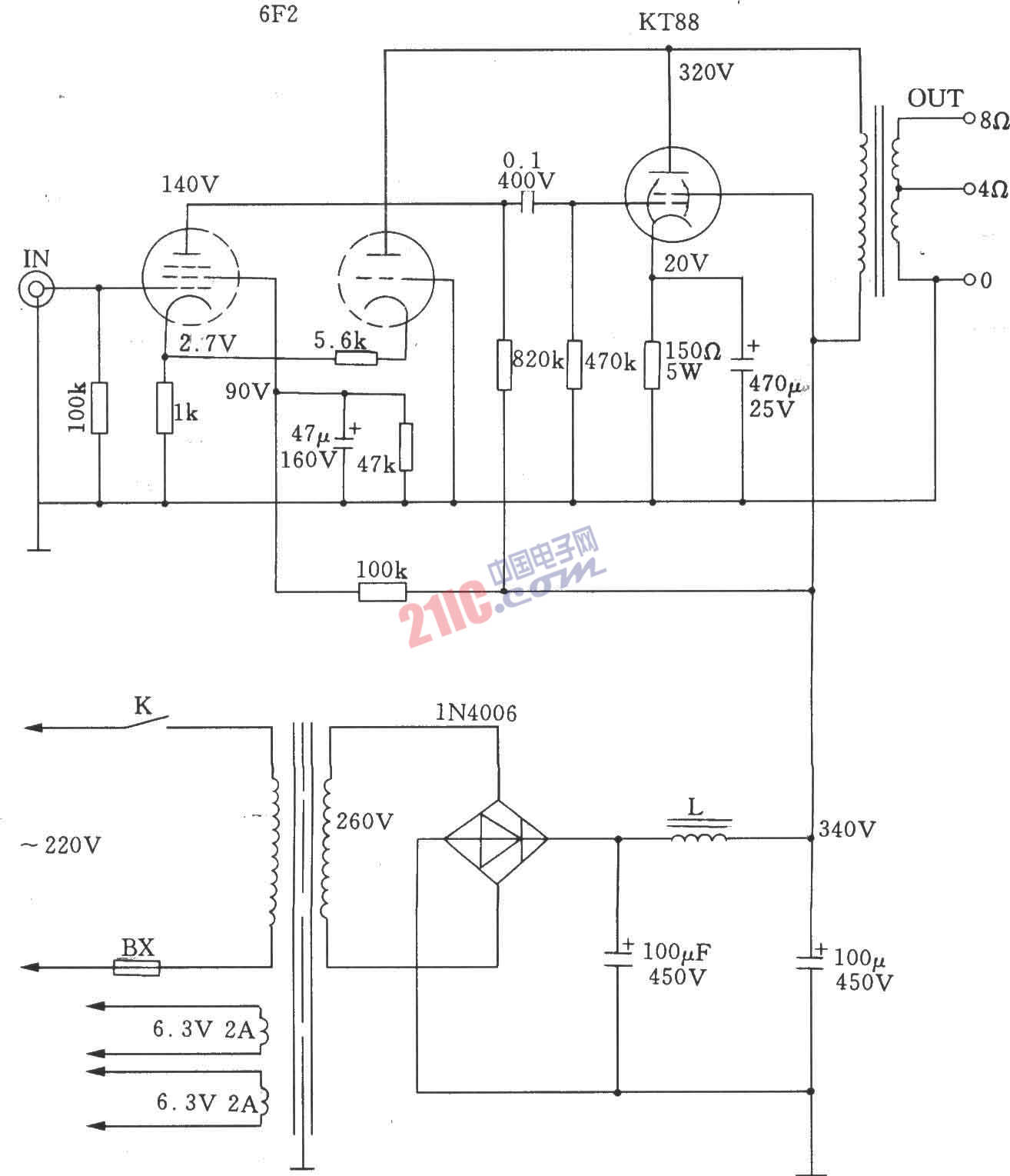 KT88超三極管接法的功毫頻率響應(yīng)特性,從20Hz~20KHz增益變化小于1dB;當(dāng)作普通標(biāo)準(zhǔn)接法時(shí),其頻響特性從20HZ~10KHz的增益變化大于2dB。