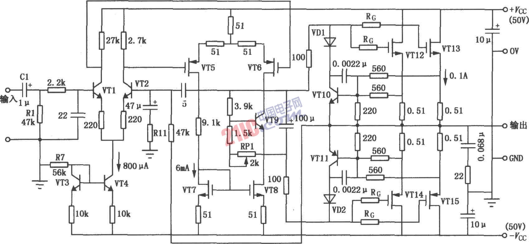 如圖所示電路是采用功率MOSFET管構成的功率放大器電路。電路中差動第二級采用2SJ77***率MOSFET,電流鏡像電路采用2SK214。其工作電流為6mA,但電源電壓較高(為±50V),晶體管會發(fā)熱,因此要接人小型散熱器。