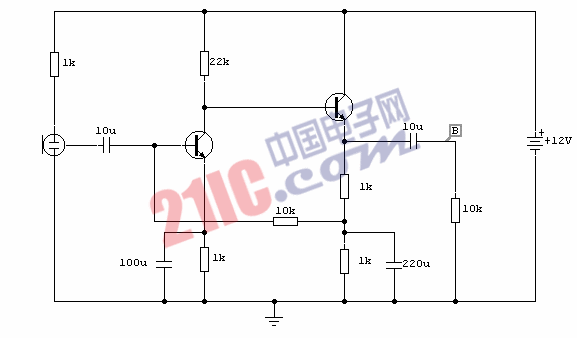 The electret condenser microphone (ECM) contains a very sensitive microphone element and an internal FET preamp, a power supply in the range 2 to 10 volts DC is therefore necessary. Suitable ECM's may be obtained from Maplin Electronics. The 1k resistor limits the current to the mic. The output impedance is very low and well suited to driving cables over distances up to 50 meters. Screened cable therefore is not necessary.