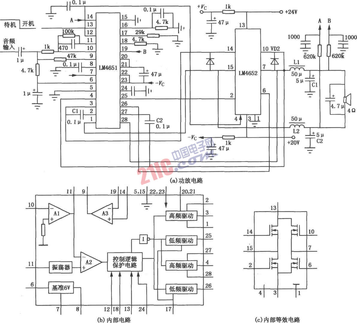 LM4651是D類放大器的前級電路,采用28腳DIP封裝,其內(nèi)部等效電路如圖(c)所示