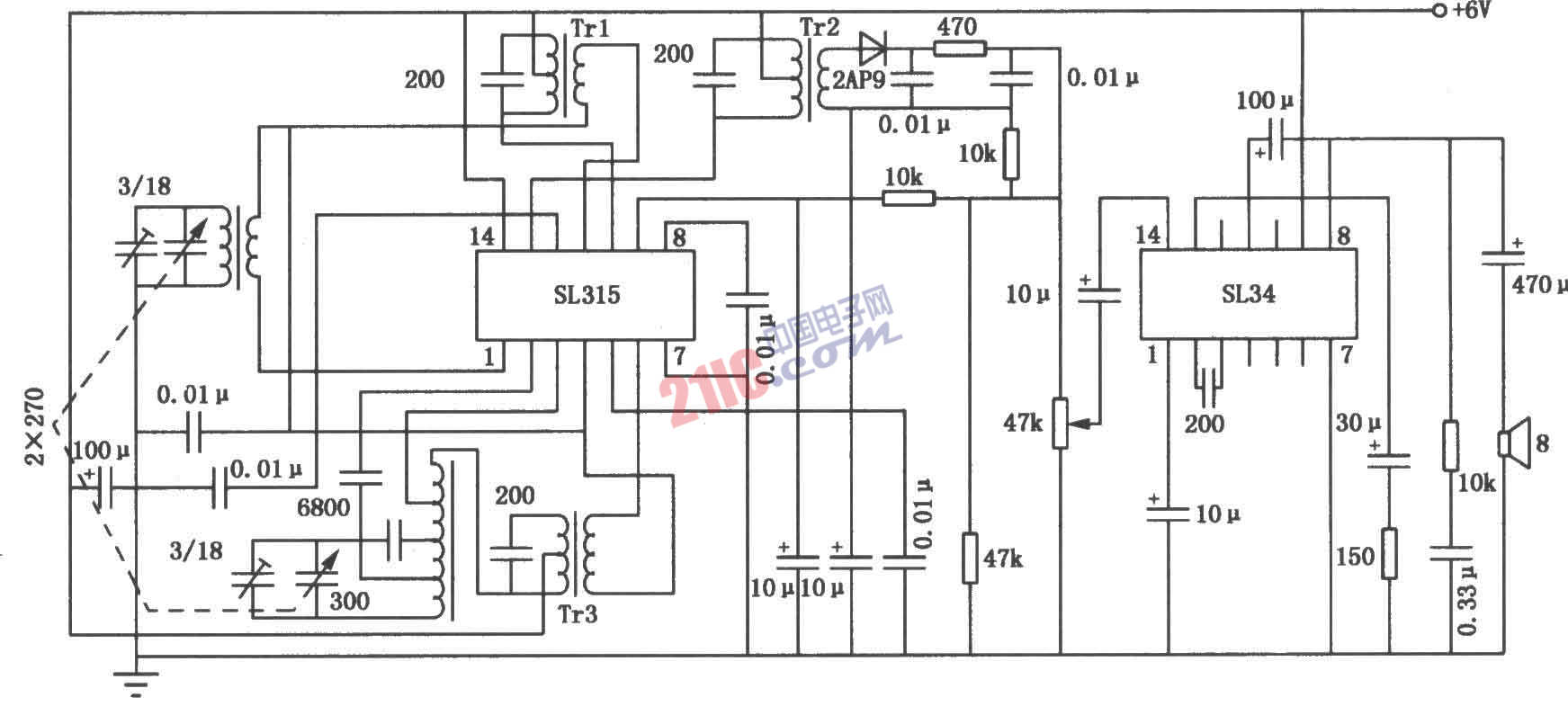 SL33/34是低電壓集成音頻功率放大器,具有失真小、功耗低等特點(diǎn),它與SL315集成變頻中放電路相配合,可構(gòu)成一個(gè)完整的收音機(jī)電路。如圖所示為由SL34和SL315構(gòu)成的中波調(diào)幅收音機(jī)電路。 |