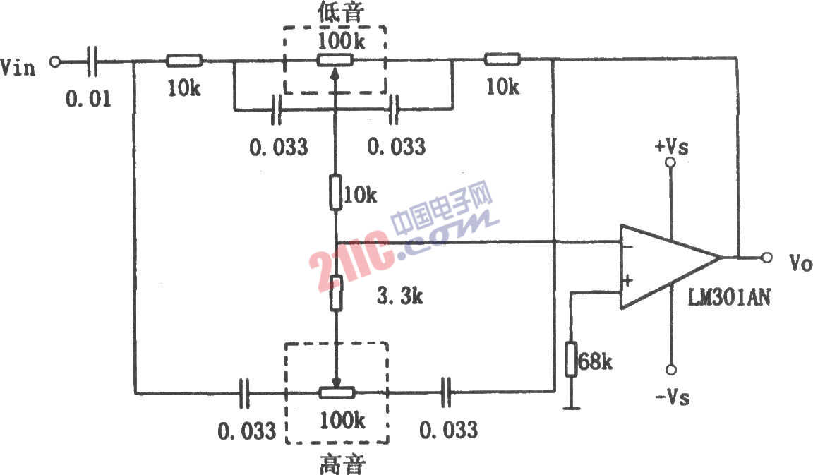 該電路采用負反饋形式來實現(xiàn)音調(diào)控制,即在負反饋環(huán)路中接RC網(wǎng)絡,電路中使用了兩個,型號為DS166,阻值為l00kΩ的電位器,分別完成高、低音調(diào)整。該電路以通用型集成運放LM301AN,組成音調(diào)控制電路。