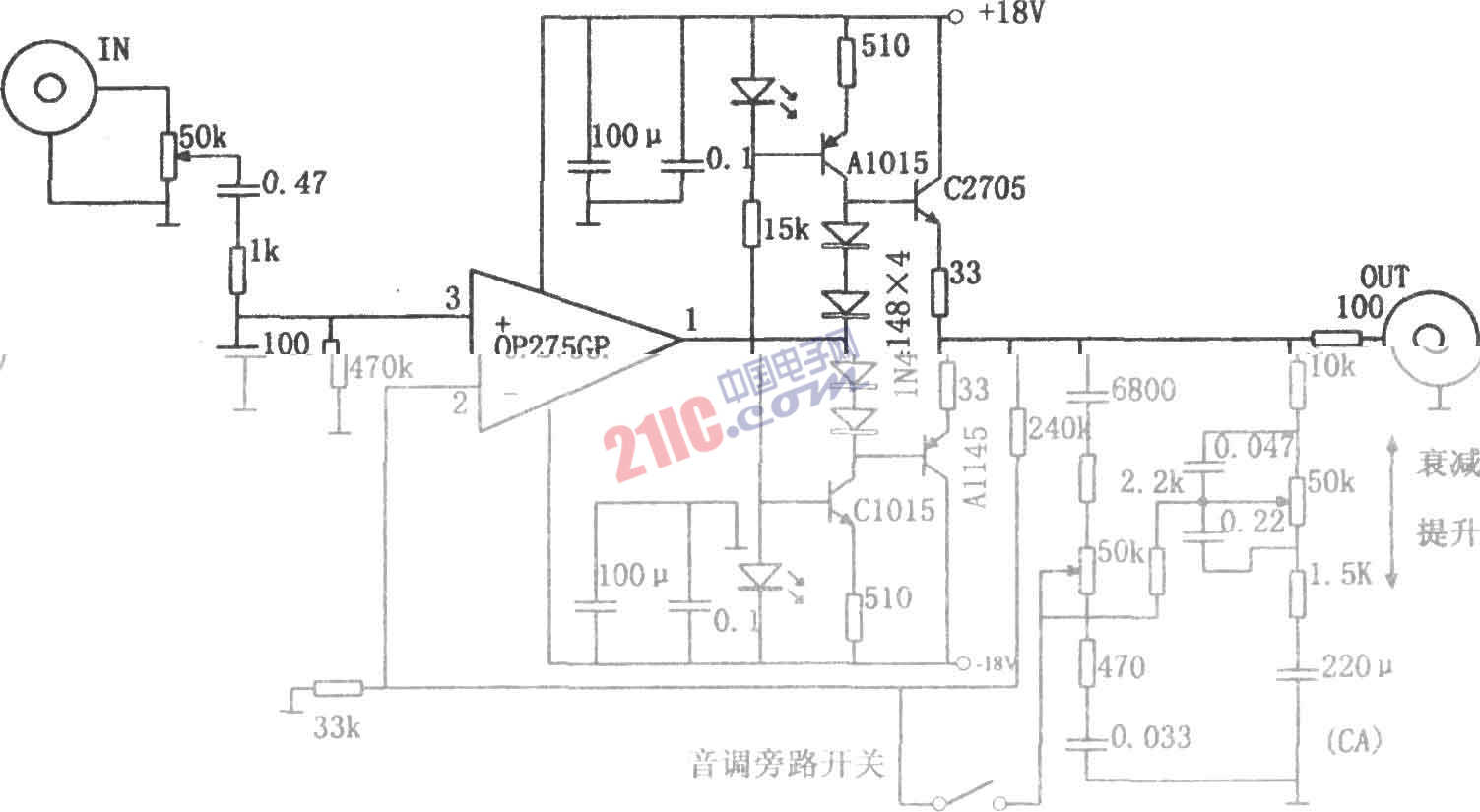如圖所示為具有音調(diào)控制的音頻放大電路。該電路采用了場效應(yīng)管輸入型雙運放OP275。輸入信號經(jīng)50kΩ的電位器、雙時常數(shù)RC網(wǎng)絡(luò)送入OP275的同相輸入端(引腳3)。由于采用了同相輸入方式,因而其輸入阻抗很高,雙時常數(shù)RC網(wǎng)絡(luò)具有選頻作用,以減小外部噪聲干擾。該電路具有放大微弱信號的能力,且失真很小,當信號幅度較大時,可調(diào)節(jié)50kΩ的電位器作適當衰減。信號經(jīng)OP275放大后由引腳l輸出,送入互補對稱功放電路,該功放級由A1015、C2705和C1015、A1145組合的復(fù)合管構(gòu)成射極輸出級,由圖可知,該功放級工作于AB類狀態(tài)。4個1N4148分別為C2705和A1145提供正偏,復(fù)合管的前級三極管的正偏也由2個1N4148二極管提供。