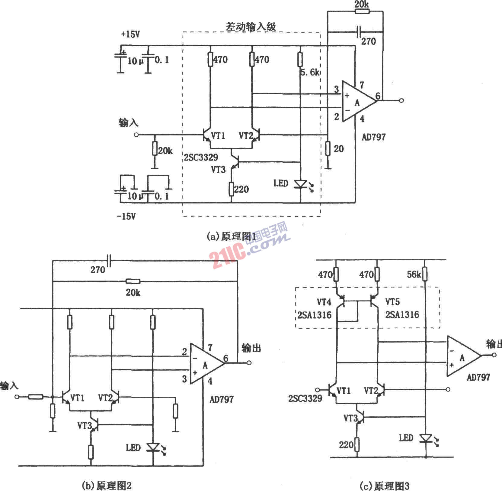 如圖所示為低噪聲高精度磁頭放大器。這三個電路的信號輸入方式各不相同。圖(a)中,輸入信號以單端輸入方式首先加到由晶體管構(gòu)成的恒流源式差動放大電路,然后又以差動方式輸出,加到運放AD797的兩個輸入端(引腳2,3),該電路采用性能優(yōu)良的三極管構(gòu)成的差動放大,可使電路具有較高的信噪比(S/N),同時能處理動態(tài)范圍較大的信號。圖(a)中3個三極管均為2SC3329,VT3作為恒流管,VT1和VT2為差動放大管。運放AD797的輸出端(引腳6)與VT2的基極間外接20kΩ的反饋電阻和270pF的補償電容,由VT2到地的20Ω電阻和20kΩ的反饋電阻決定電路的電壓放大倍數(shù),270pF補償電容提高電路的穩(wěn)定性。正、負電源端(引腳7、4)到地分別外接兩個電容(10μF的電解電容和0.1μF的有機合成膜電容),以作為去耦電容。這樣既可濾除高頻干擾,也能濾除低頻干擾。
