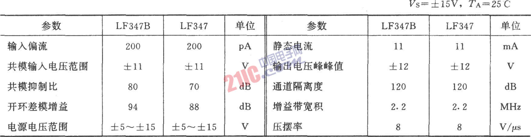 集成四運放347的主要參數(shù):