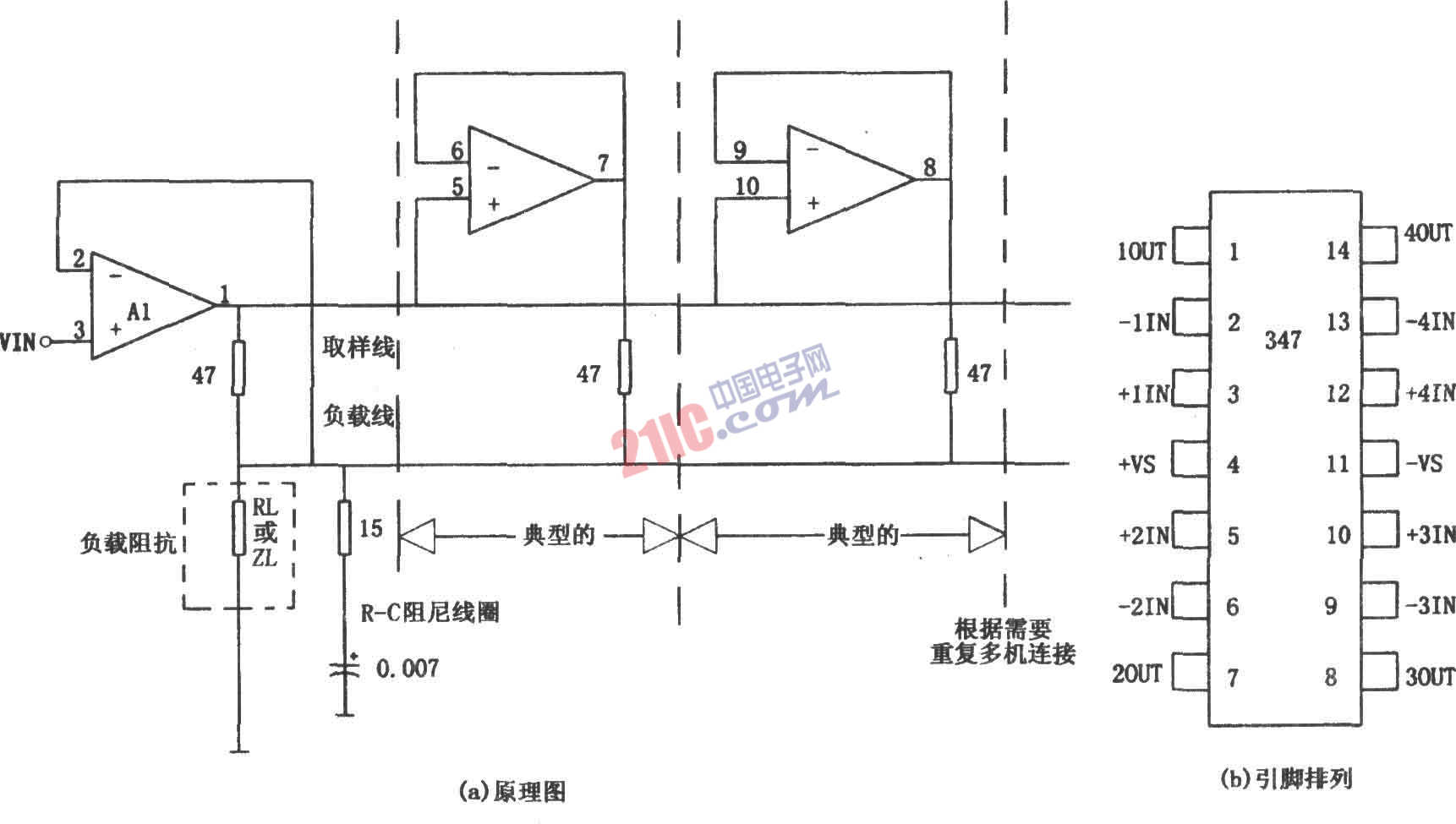 把兩個或更多個放大器的輸出組合起來可構(gòu)成復(fù)合并聯(lián)緩沖器,如圖所示。電路的輸出電流是多個并聯(lián)運放的輸出電流之和。A1、A2可選用通用集成四運放LF347(或LM324、OP496、TL35074等)。