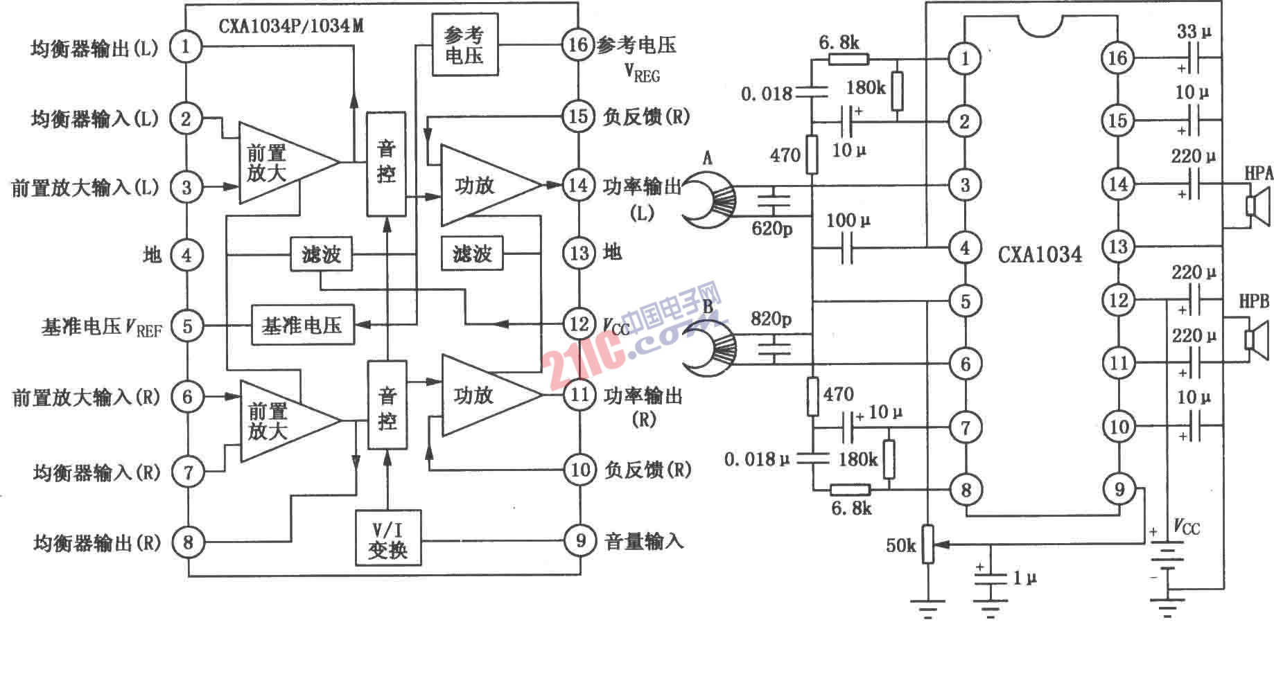 左圖為CXA1034P/1034M的內(nèi)部電路框圖,右圖為其典型應(yīng)用電路。