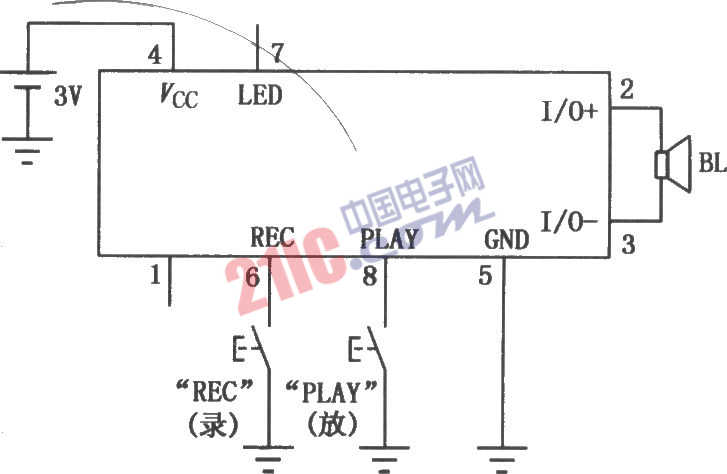 PT-8820的典型應(yīng)用電路如圖所示。錄音時(shí)按下“REC”鍵,對(duì)著揚(yáng)聲器BL講話即可。當(dāng)芯片的REC端為高電平時(shí)錄音停止。放音總是從錄音內(nèi)容的起始處開(kāi)始。當(dāng)按動(dòng)一下“PLAY”鍵,電路受到低電平觸發(fā)后,揚(yáng)聲器BL則播放錄入的語(yǔ)音,芯片的PLAY端處于高電平時(shí)放音停止。如果按住“PLAY”鍵不松手,使集成電路的PLAY端始終為低電平,則放音處于循環(huán)狀態(tài)。