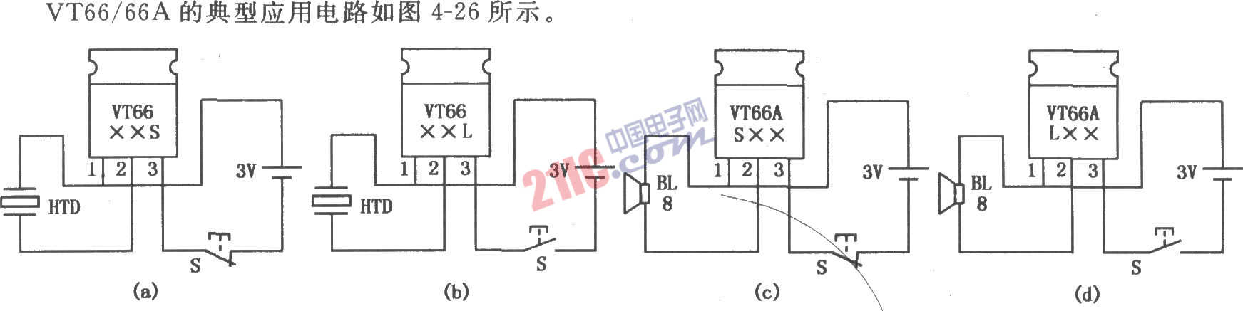 VT66/66A采用TO92形式封裝,其外形與塑封9013型晶體三極管酷似,且自身帶有一塊金屬散熱片,有3只引出腳,使用時(shí)與一般晶體三極管一樣方便,故也有人稱(chēng)它為音樂(lè)三極管。如圖所示為其典型應(yīng)用電路。