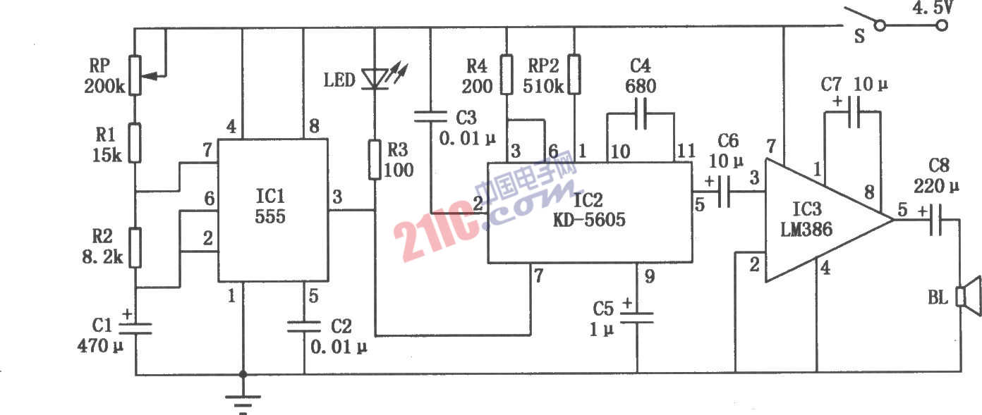 電子貓電路如圖所示。ICl為時(shí)基集成電路NE555,它與電位器RP、電阻Rl、R2和電容Cl組成時(shí)間控制電路,用來控制貓叫聲的間隔。IC2為貓叫聲集成電路KD-5605,它將貓的叫聲固化在電路內(nèi)部。合上開關(guān)S,電源經(jīng)RP、Rl、R2向Cl充電,Cl兩端電壓充到電源電壓2/3時(shí),ICl的③腳輸出低電平,發(fā)光二極管LED通電發(fā)光,同時(shí)IC2得電工作,其輸出的貓叫信號(hào)經(jīng)IC3功率放大后,推動(dòng)揚(yáng)聲器BL發(fā)出洪亮逼真的貓叫聲,達(dá)到驅(qū)鼠目的。與此同時(shí),ICl內(nèi)部放電管導(dǎo)通,Cl貯存電荷經(jīng)R2向IC1⑦腳放電。當(dāng)Cl兩端電壓降至電源電壓l/3時(shí),ICl的③腳輸出高電平,LED熄滅,IC2也失電停止工作,貓叫聲停止。電源又通過RP、Rl、R2向C1充電,電路如此循環(huán)工作。