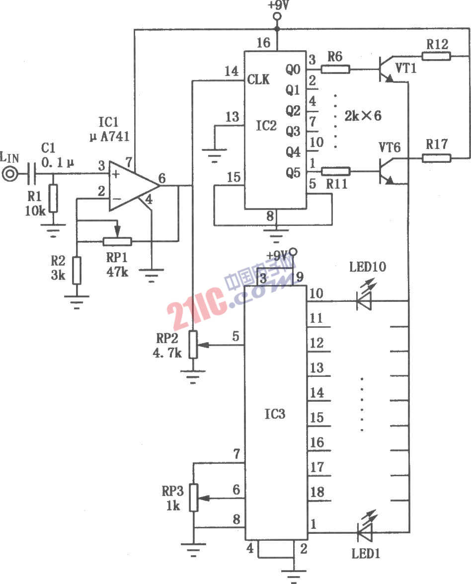 本電路以復合顯示的形式指示音頻,一方面它可根據(jù)音頻信號電平幅度的大小驅動一組發(fā)光二極管LED作條狀指示{另一方面,音頻信號中的變化成分控制各LED按六級不同的發(fā)光亮度逐漸變化,LED亮度變化的節(jié)奏隨音頻信號的變化情況不斷改變。一組LED采用上述兩種顯示方式的復合控制,得到的效果將更富變化感、音樂感,增強了渲染力。 |