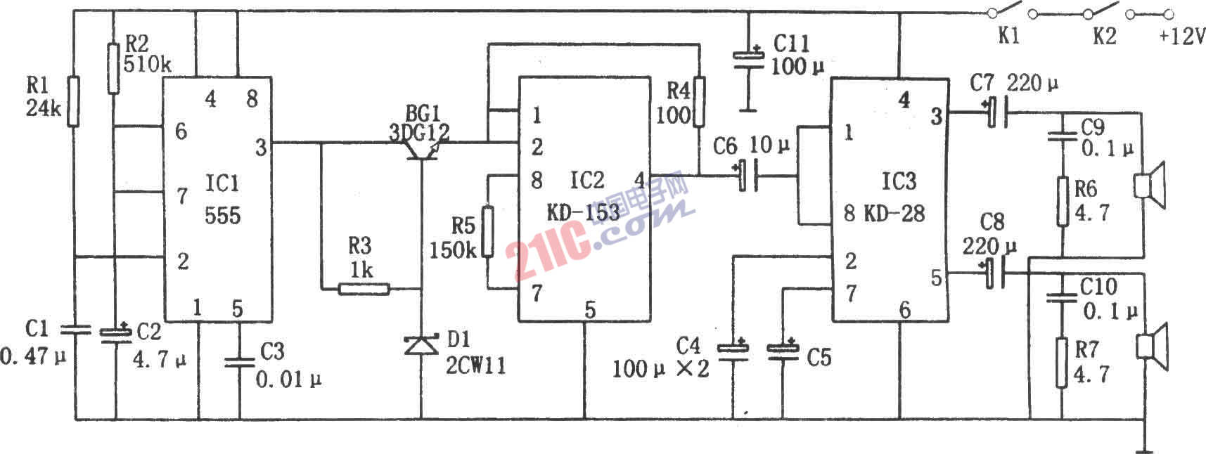 如圖所示為公共汽車關(guān)門自動(dòng)通報(bào)電路。該電路由單穩(wěn)延時(shí)電路、叮咚聲集成電路KD-153、雙功率放大集成電路KD-28、音響電路(揚(yáng)聲器)等組成。 單穩(wěn)延時(shí)電路由IC1(555)和R1、C1、R2、C2組成。在微動(dòng)開(kāi)關(guān)K1、K2合上瞬聞,C1上電壓不能突變,555因②腳為低電平(<1/3VDD)而發(fā)生置位,③腳輸出的高電平使BG1導(dǎo)通,相應(yīng)KD-153得電工作,輸出的叮咚信號(hào)經(jīng)KD-28放大后驅(qū)動(dòng)2只揚(yáng)聲器發(fā)聲。與此同時(shí)。C2進(jìn)行充電,當(dāng)C2充到使⑥腳電位達(dá)到2/3VDD時(shí),555發(fā)生復(fù)位。相應(yīng)揚(yáng)聲器停止發(fā)聲。揚(yáng)聲器發(fā)聲對(duì)應(yīng)的這一段時(shí)間即單穩(wěn)電路的延時(shí)td=1.1R2C2,圖示參數(shù)對(duì)應(yīng)約為3秒。改變充電時(shí)間常數(shù)R2C2,即可調(diào)節(jié)音響的時(shí)間。