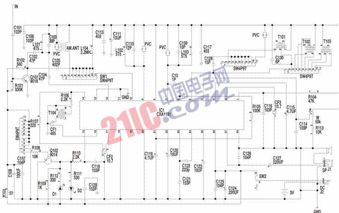 按動(dòng)SW7,Q2截止Q3導(dǎo)通u1第15腳為低電平u1內(nèi)部自動(dòng)切換為調(diào)幅波段,將中波、短波轉(zhuǎn)換開(kāi)關(guān)至于Mw時(shí),此時(shí)磁棒天線感應(yīng)到的高頻調(diào)幅中波信號(hào)經(jīng)PVC選頻,由波段開(kāi)關(guān)SWl轉(zhuǎn)換送入u1的10腳。中波波段本振電路由T101、PVC等元件組成,u1的5腳的本振信號(hào)與10腳的選頻信號(hào)同時(shí)加到內(nèi)部混頻器,混頻得出455kHz調(diào)幅中頻信號(hào),455kHz中頻信號(hào)從14腳輸出。推動(dòng)中短波開(kāi)關(guān)選擇短波1~8波段,從拉桿天線接收到的短波高頻信號(hào)經(jīng)c101到Q101放大經(jīng)c1 02耦合到中短波開(kāi)關(guān)SWl波段開(kāi)關(guān)轉(zhuǎn)換從u1第10腳輸入。短波1~8的本振回路由T102、T1 03、PVC、c112、c113等元件組成。本振信號(hào)經(jīng)波段開(kāi)關(guān)SWl轉(zhuǎn)換從5腳輸入,與10腳的短波高頻信號(hào)一起送到混頻器混頻后得出455kHz的中頻信號(hào)從1 4腳輸出。1 4腳輸出的調(diào)幅中頻信號(hào)經(jīng)R1 06、T1 04、cFl選頻,濾除455kHz帶寬以外大部份雜波后,送至u1的1 6腳輸入,中頻信號(hào)在l C內(nèi)部進(jìn)行放大、檢波,檢波后的音頻信號(hào)由23腳輸出。調(diào)幅另一路本振信號(hào)經(jīng)c114送至顯示驅(qū)動(dòng)SC361O第33腳輸入其內(nèi)部進(jìn)行處理,處理后的頻率數(shù)字化準(zhǔn)確顯示在屏幕上。