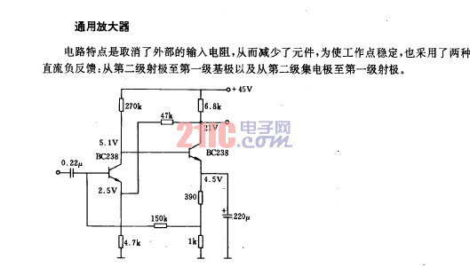 該電路前級為有強(qiáng)負(fù)反饋的共射極電路,后一級為射極跟隨器,從而使輸入阻抗為|Z1|=3.6兆歐,而輸出電阻僅為|Z2|=250歐。電路的工作頻率為20~20000Hz,在低至2.5V輸出電壓時(shí)