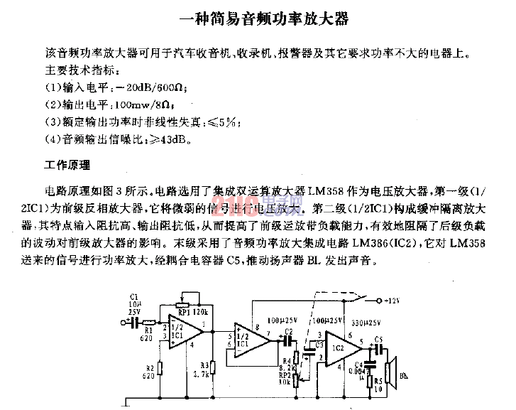 LM386電源電壓4--12V,音頻功率0.5w.LM386音響功放是由NSC制造的,它的電源電壓范圍非常寬,最高可使用到15V,消耗靜態(tài)電流為4mA,當(dāng)電源電壓為12V時(shí),在8歐姆的負(fù)載情況下,可