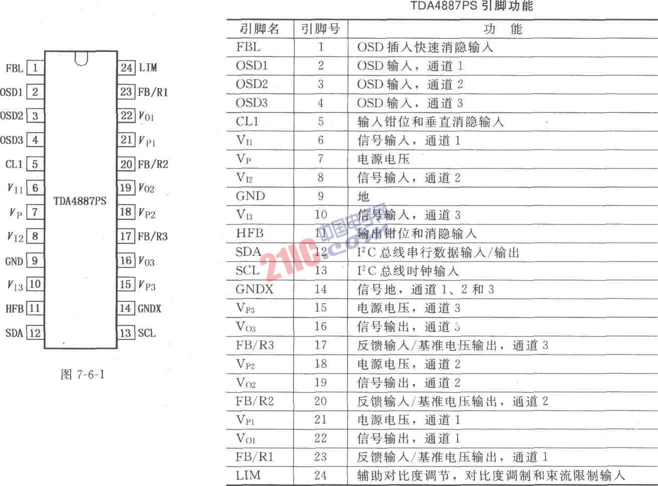 TDA4887PS是用于15''和17''彩色監(jiān)視器系統(tǒng)的RGB前置放大器單片集成電路,它具有I2C總線控制和OSD,以及束流限制和對(duì)比度調(diào)制等功能。IC提供亮度控制,既可具有灰度等級(jí)跟蹤,也可以不具有灰度等級(jí)跟蹤但容易調(diào)整的亮度控制。信號(hào)放大后可以驅(qū)動(dòng)通用視頻模式的彩色監(jiān)視器,也可以用于其他個(gè)別視頻模式的解決方案。有兩種黑色電平控制形式可以選擇:具有陰極DC耦合負(fù)反饋的黑色電平控制;具有陰極AC耦合正反饋和外部控制可關(guān)斷DAC輸出的黑色電平控制。TDA4887PS特別有利用于與TDA485X監(jiān)視器偏轉(zhuǎn)IC系列聯(lián)合使用。TDA4887PS的引腳排列及功能如圖所示。