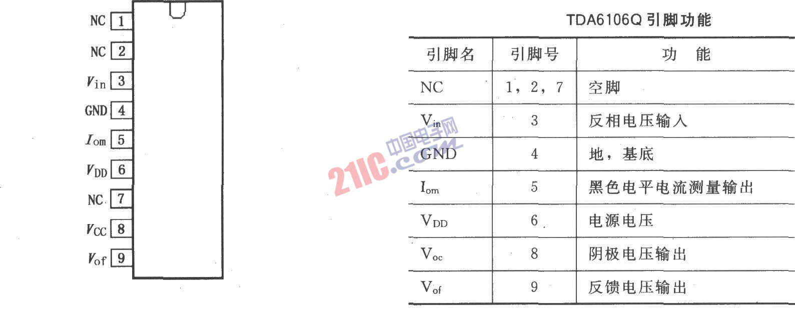 TDA6106Q是具有6MHz帶寬的視頻輸出放大器,9引腳塑料DIL-彎曲-SIL***率封裝。TDA6106Q采用高壓DMOS技術(shù),用于驅(qū)動彩色CRT陰極,無需外部散熱器。該放大器采用黑色電平電流控制,以獲得最大使用性能,內(nèi)部保護(hù)電路可防止陰極射線管(CRT)出現(xiàn)正電壓放電跳火。TDA6106Q的引腳排列及功能如圖所示。