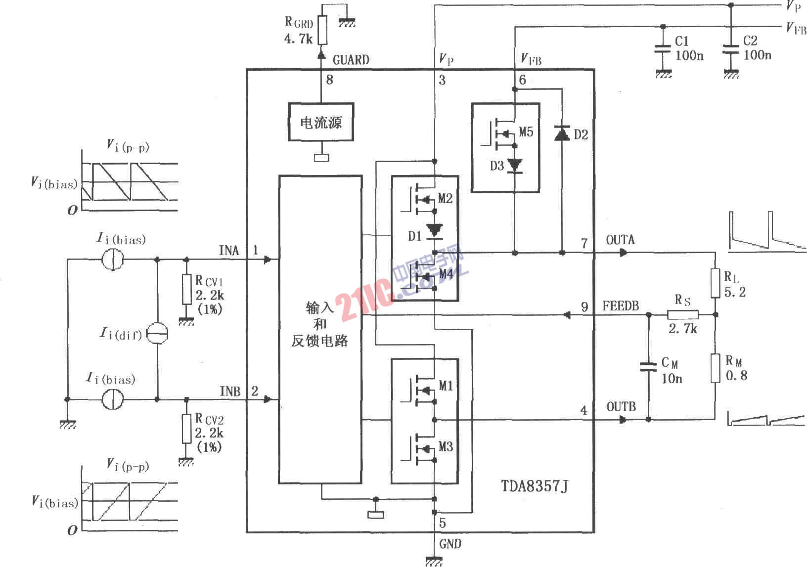 如圖所示為T(mén)DA8357J/8359J的測(cè)試電路。該電路是在推挽功率放大器輸出端用電阻作為假負(fù)載替代偏轉(zhuǎn)線圈進(jìn)行測(cè)試。