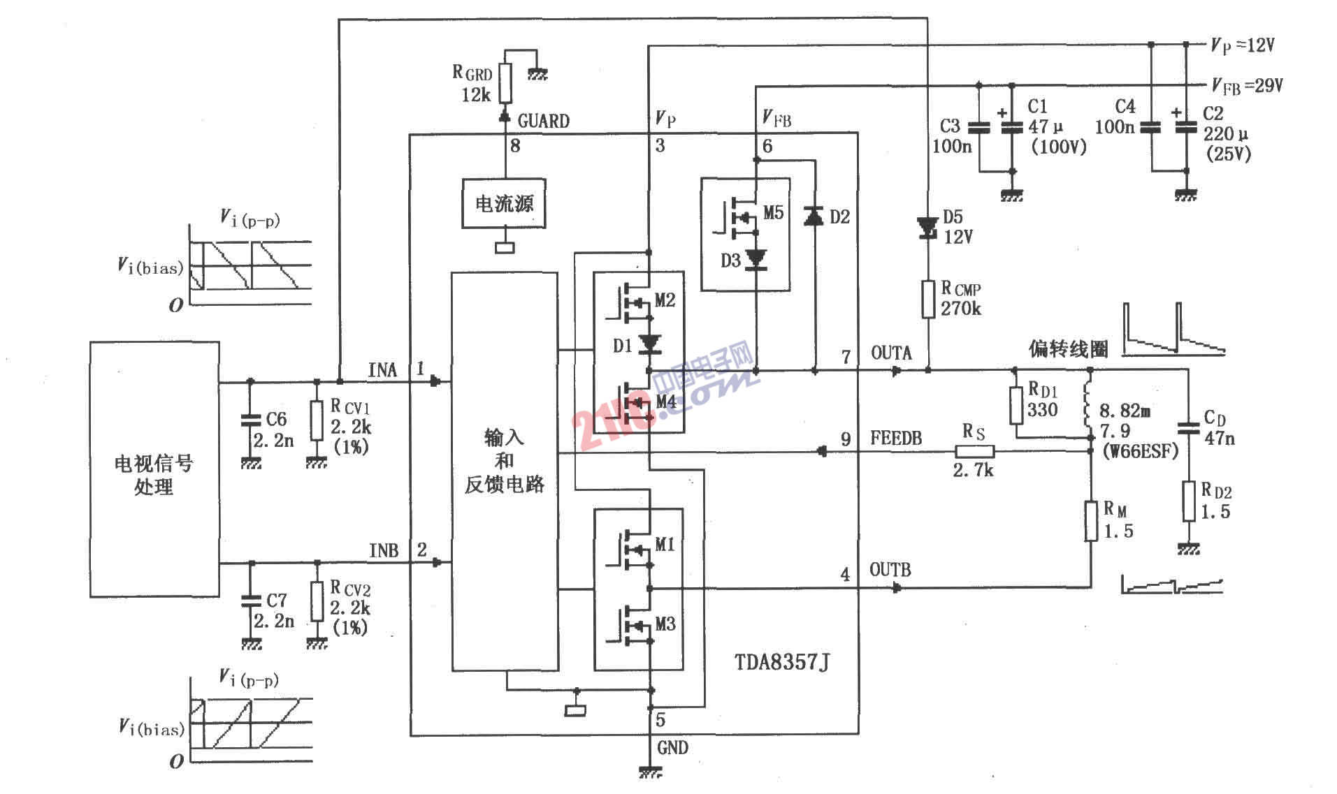 如圖所示為T(mén)DA8357J/8359J應(yīng)用電路。電視信號(hào)處理電路輸出的信號(hào)分別輸入