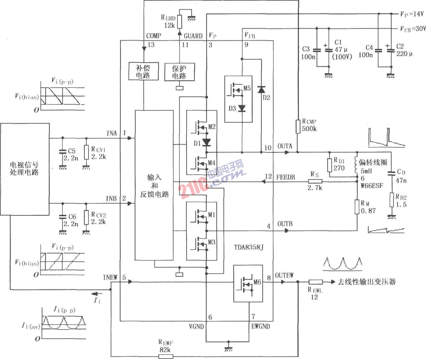 如圖所示為TDA8358J的實際應(yīng)用電路。電視信號處理電路輸山的信號分別輸入TDA8358J的1、2腳,正鋸齒波電壓輸入1腳,負(fù)鋸齒波電壓輸入2腳。信號在內(nèi)部經(jīng)過差分放大器及推挽功率放大器后,由10、4腳輸出加到偏轉(zhuǎn)線圈兩端。電阻RM與偏轉(zhuǎn)線圈串聯(lián),提供反饋電壓經(jīng)Rs由12腳輸入,使輸出的鋸齒波的線性得以改善,并且擴(kuò)大鋸齒波的動態(tài)范同。調(diào)整電阻RM和RCV可改變輸出電流,輸出電流最大值不能超過3.2Ap-p。