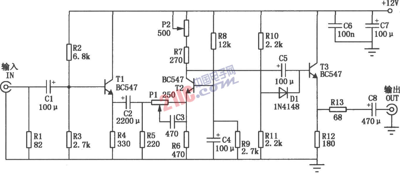如圖所示的增強電路可以增加視頻信號的高頻分量,從而增強電視圖像的對比度,還可將它接到錄像機輸出端和電視機SCART輸入端之間。電路中的三極管Tl起緩沖作用。電阻Rl保證該增強電路的輸入阻抗約為75Ω。信號加到放大級T2上,其增益取決于電位器P2的位置。T2基極信號的頻率特性受Pl、R6、C6的制約,故而在一定程度上可由用戶控制(通過Pl)。緩沖級T3提供了足夠的電流,用于正確驅(qū)動絕大多數(shù)75Ω的負載。調(diào)節(jié)電位器P2,使輸出為1Vp-p(對開路輸出,電平應(yīng)為2Vp-p)。