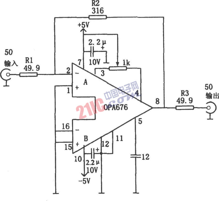 如圖所示為具有50Ω輸入/輸出阻抗的寬帶視頻放大電路。為了實(shí)現(xiàn)信號(hào)匹配傳輸,減小信號(hào)的反射,常需要輸入、輸出阻抗均為50Ω的寬帶視頻放大電路。一種能實(shí)現(xiàn)上述要求的放大電路如本圖所示。