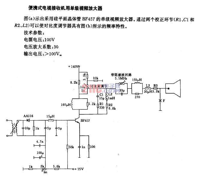 該場效應晶體管共源共柵視頻放大器的特點包括非常低的輸入負載以及其反饋可降低至零。使用2N5485是由于它的電容很低,而Yfs卻很高。該放大器的頻帶寬度受R1和負載電容的限