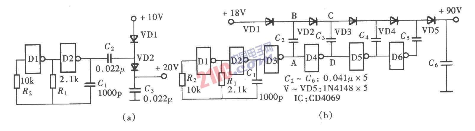 利用門電路組成的倍壓升壓電路,可以為某些電子設(shè)備提供所需要的高壓工作電源。該電源雖然輸出電流不夠大,但對某些只需足夠高的電壓而不需較大電流的電路來說,是一種經(jīng)濟而方便的電源。這種電源的電路組成如圖所示。