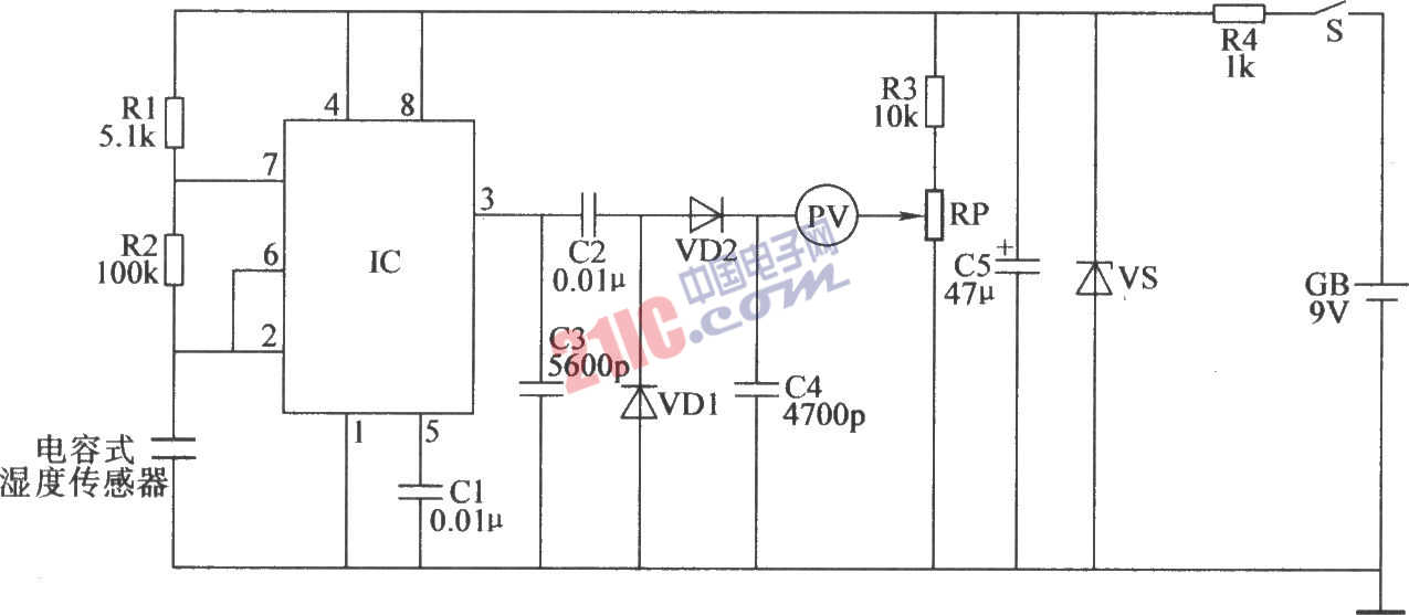 元器件選擇 R1~R3均選用1/4W碳膜電阻器;R4選用1/2W金屬膜電阻器。 RP選用合成膜電位器。 C1和C2選用滌綸電容器或獨(dú)石電容器;C3和C4均選用高頻瓷介電容器;C5選用耐壓值為l6V的鋁電解電容器。 VD1和VD2選用2AP9型鍺普通二極管或IN4148型硅開關(guān)二極管。 VS選用2CW14或2CW55(1/4W、6~7.5V)型硅穩(wěn)壓二極管。 IC選用NE555或5G1555型時(shí)基集成電路。 S選用動(dòng)合按鈕。 GB選用9V疊層電池。 PV選用0~2.5V的直流電壓表。