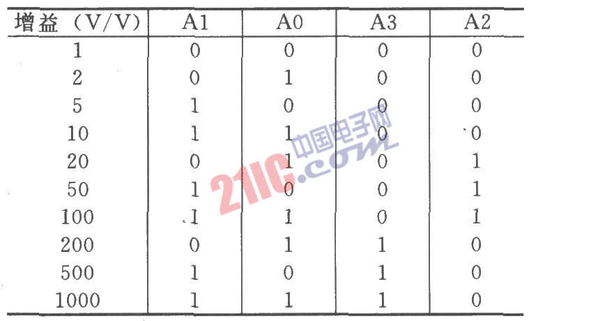 PGA206/207是適合用于數(shù)據(jù)采集的數(shù)字控制可編程增益儀表放大器。其快速穩(wěn)定時間使之在多路采集系統(tǒng)中能高效地工作。如圖所示為由PGA207與PGA103構成的寬增益范圍可編程放大器,增益范圍為1~1000。電路采用兩級級聯(lián)的方式構成,電路總的增益為兩級增益之積,即G=G1G2。PGA207與PGA103增益設置及總增益見下表。