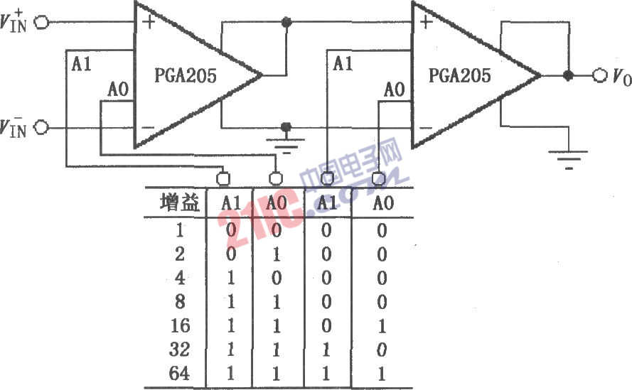 如圖所示為由PGA205構(gòu)成的二進(jìn)制增益步長(zhǎng)電路,增益范圍為1~64。該電路采用兩級(jí)PGA205級(jí)聯(lián)的方式構(gòu)成,電路總的增益為兩級(jí)增益之積,即G=G1G2。各個(gè)PGA205的增益設(shè)置見(jiàn)圖中所示。