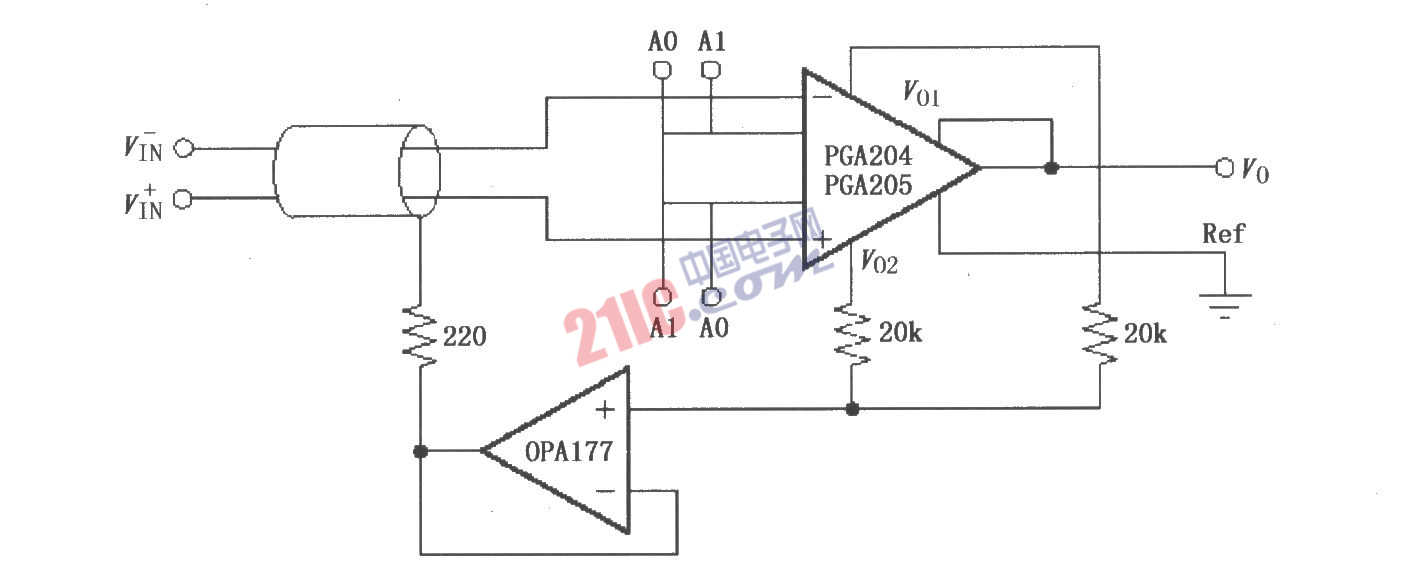 如圖所示為由PGA204/205構(gòu)成的屏蔽驅(qū)動(dòng)電路。由抗干擾理論與實(shí)踐證明,傳輸弱信號(hào)的電纜線的屏蔽層加上一定電位時(shí),將大大減小由屏蔽層與芯線之間分布電容耦合引入的干擾。圖中電路便是基于這種考慮,用運(yùn)放OPA177構(gòu)成屏蔽層驅(qū)動(dòng)器,輸入信號(hào)來(lái)自于PGA204/205,由OPA177電壓跟隨器輸出后加到屏蔽層,即屏蔽層電位被抬高到儀表放大器內(nèi)部運(yùn)放輸出的電位,從而使電纜線上的干擾大大減小。