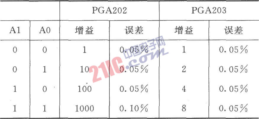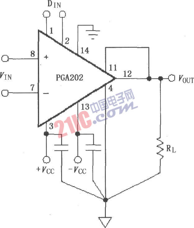 如圖所示為PGA202信號(hào)和電源的基本連接電路,各個(gè)電源端都要用1μF的鉭電容旁路濾波。為了發(fā)揮芯片的最大性能,在設(shè)計(jì)印刷電路板時(shí)應(yīng)使鉭電容盡可能靠近電源腳。為避免外圍元件引入增益和CMR誤差,各個(gè)元件接地時(shí)應(yīng)按圖中所示采用“一點(diǎn)接地”方式。Sense端(11腳)和VREF端(④腳)如有任何電阻都將導(dǎo)致增益產(chǎn)生誤差,為了避免增益誤差,引線應(yīng)盡可能短。為了保持放大器穩(wěn)定,應(yīng)盡量避免在輸出端到輸入端或失調(diào)調(diào)節(jié)端跨接電容器。軟件增益的選擇下表。