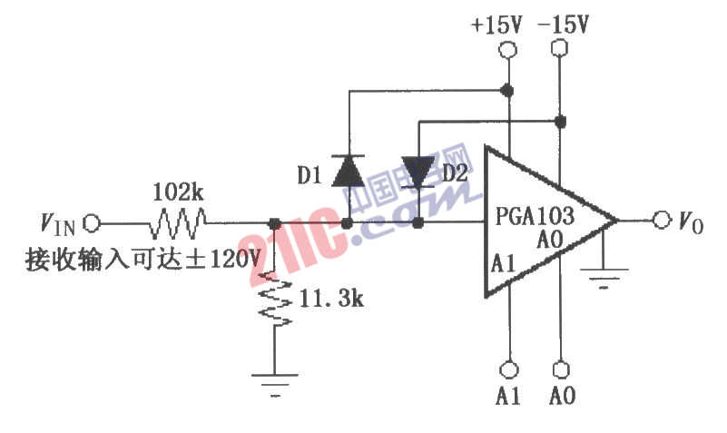 如圖所示為由PGA103構(gòu)成的寬輸入電壓范圍放大器。11.3kΩ與102kΩ電阻組成分壓電路,分壓比約為1/10,如當(dāng)輸入電壓120V時(shí),經(jīng)過分壓后加到PGA103輸入端的電壓只有12V,因此可以寬電壓輸入。同時(shí),二極管D1、D2(取1N4148)起到雙向鉗位作用,使輸入PGA103的電壓為±15~士0.7V。