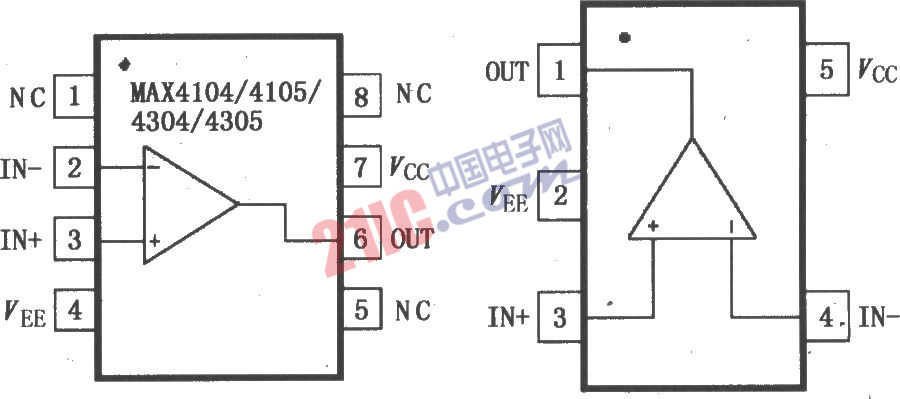 MAX4104/4105/4304/4305運算放大器具有極高速、低噪聲和低失真性。MAX4104是單位增益穩(wěn)定補償,提供625MHz帶寬和400V/μs轉(zhuǎn)換速率,工作時僅需要20mA電源電流。MAX4304是增益補償(AvcL=2V/V或更大),提供730MHz帶寬和1000V/μs轉(zhuǎn)換速率。MAX4105是最小增益補償(AvcL=10V/V),提供410MHz帶寬和1400V/μs轉(zhuǎn)換速率。MAX4305是最小增益補償(AvcL=10V/V),提供340MHz帶寬和1400V/μs轉(zhuǎn)換速率。這些放大器具有低電壓噪聲密度和無寄生動態(tài)范圍大等特性,是低失真/低噪聲視頻和遠程通信技術(shù)應(yīng)用的理想選擇。這些運放的輸出電壓擺幅大(±3.7V)、輸出電流能力強(±70mA),其引腳排列如圖所示。