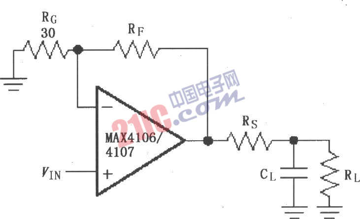 如圖所示為由MAX4106/4107采用隔離電阻Rs構(gòu)成的驅(qū)動電容性負(fù)載電路。MAX4106/4107具有良好的交流特性,但是它們不是設(shè)計用于驅(qū)動高電抗性負(fù)載的,如在高電抗性負(fù)載中使用會降低其相位容限,引起脈沖信號過沖振鈴和振蕩。該電路可消除可能引起的上述問題,在輸出端與負(fù)載之間加的隔離電阻Rs,可用于抑制過沖振鈴和振蕩,Rs阻值為10~20Ω。當(dāng)芯片為MAX4106,且RF為120Ω時,增益為5V/V;當(dāng)芯片為MAX4107,且RF為270Ω時,增益為10V/V。