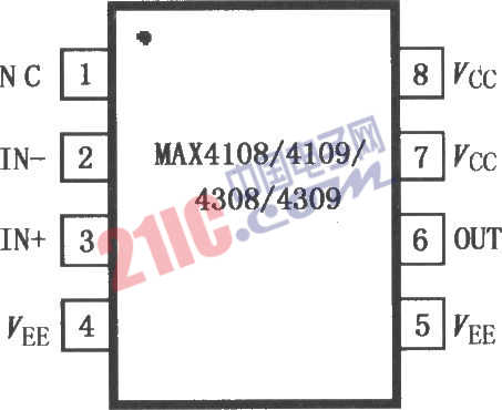 MAX4108/4109/4308/4309運(yùn)算放大器具有極高速和極低失真特性。 MAX4108是單位增益穩(wěn)定補(bǔ)償;MAX4109、MAX4308和MAX4309分別是(AVCL)2V/V、5V/V和10V/V最小閉環(huán)增益補(bǔ)償。MAX4108提供4000MHz單位增益帶寬和1200V/μs轉(zhuǎn)換速率。極低的失真可提供一個無寄生動態(tài)范圍(SFDR),在頻率為5MHz時為-93dBc(VOUT=2VP-P,RL=100Ω),這些特性使得這些放大器成為高性能射頻(RF)信號處理的理想選擇。這些高速運(yùn)放具有寬的輸出電壓擺幅和大的輸出驅(qū)動能力(90mA),其引腳排列如圖所示。