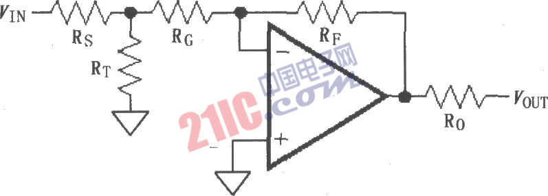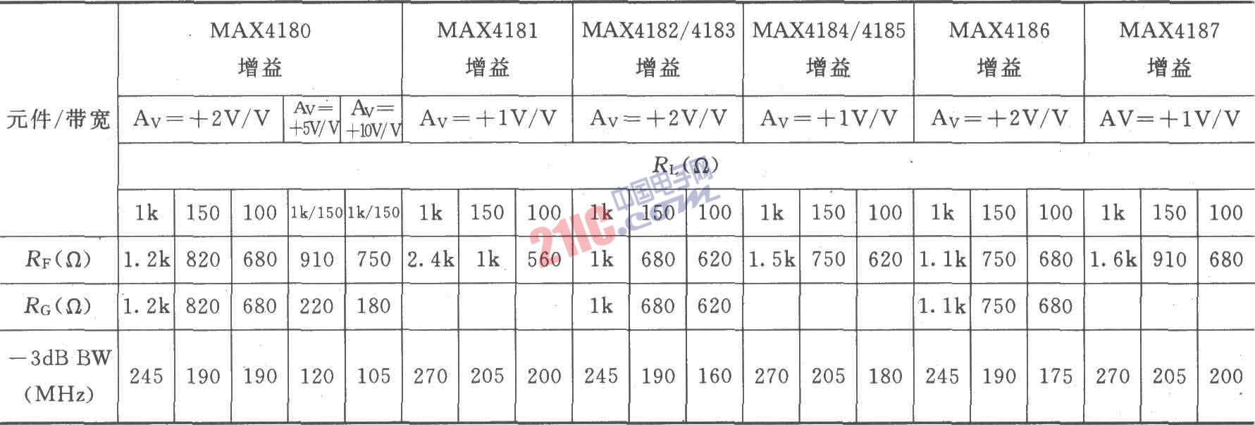 如圖所示為由MAX4180~MAX4187構成的反相增益電路,電阻的精度選用1%,VOUT=-(RF/RG)VIN推薦電阻及帶寬、增益等參數(shù)下表。